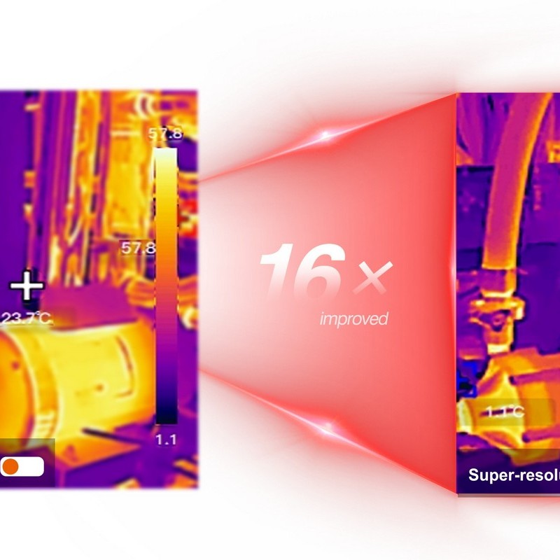 Super resolution is an image enhancement technology that improves thermal image quality by 4×, increasing the effective resolution from 160×120 (19,200 pixels) to 320×240 (76,800 pixels). This enhancement reveals finer details and provides clearer thermal patterns, allowing for more accurate diagnosis of issues. The super resolution function is available through the included PC analysis software.