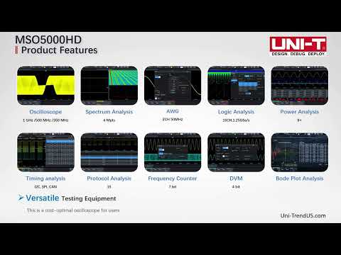 Oscilloscope, spectrum analyzer, protocol analyzer, arbitrary waveform generator, digital voltmeter, frequency counter, Bode plot analyzer, power analyzer, and pattern generator in one instrument. The MSO5000HD expands the protocol library with next-generation interfaces including I3C, CAN-XL, and 1-Wire.